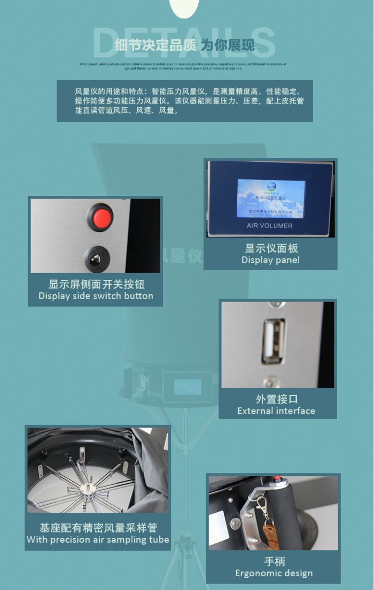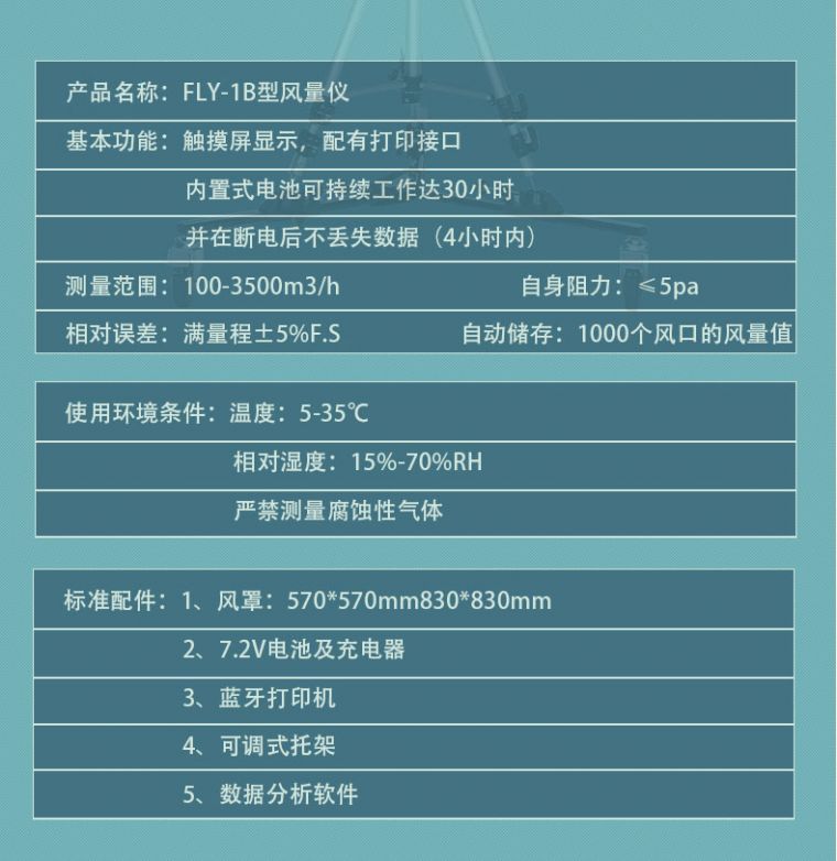 FLY-1B型风量仪采用皮托管式原理,对风压进行多点、多次自动检测,产生平均风量(m3/h)具有正确、快速、简便的特点,广泛应用于暖通空调、净化技术等行业进行风口和管道风量的直接测定,从而对集中空调的风量实施综合管理及温度、湿度、洁净度等参数的自动控制。为了方便客户现场检测工作,我们专门配备了移动式支架,高可升高2.2m,(含风量仪本体0.9m),整体可升至3.1m。FLY型风量仪可以进行送风口和回风口的测量,为测试带来便利。本厂根据国外同类产品的技术,在国内推出该产品的生产,并获得国家。每一台FLY型风量仪的出厂都通过严格的0.5级标准风洞标定装置进行多点风量校正,为用户直接测定风量提供可靠的保证