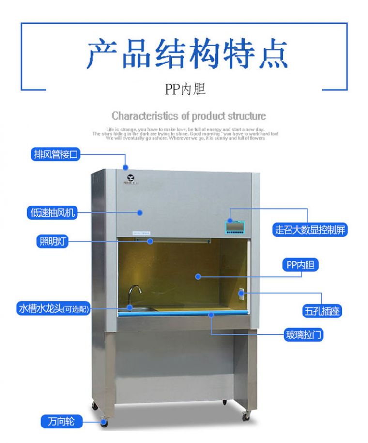 水、电、气、通风一体制,内装多功能电源插座,便于实验过程中试用其它电器设备。采用快开阀,便于实验过程中用水方便。前挡板为可上下移动玻璃门,顶部为低速抽风机,可将实验过程中的有害有味气体顺利排出。工作面底部装有不锈钢水槽,可将消毒液、实验残留物通过水洗从一排水槽排出,保持实验环境安全、可靠。