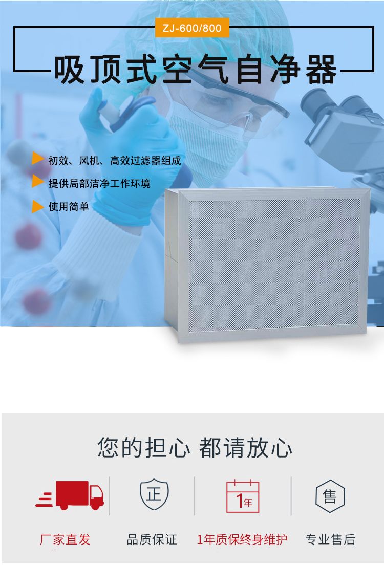 空气自净器的风机组将预过滤器的空气吸入静压箱,并送入高效过滤器,这样洁净空气以均匀的断面风速从高效过滤器内吹出,从而形成达到要求的洁净区域。
