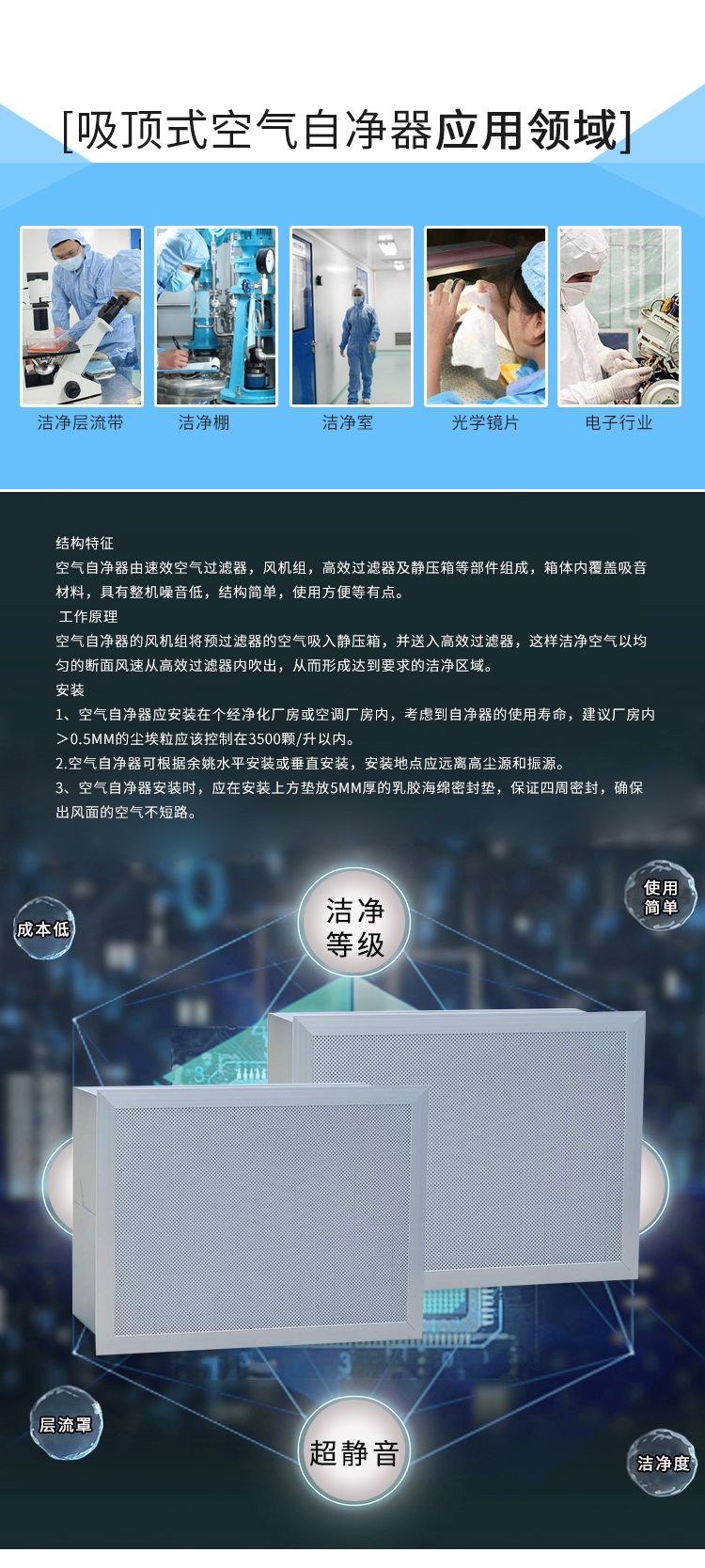 空气自净器由速效空气过滤器,风机组,高效过滤器及静压箱等部件组成,箱体内覆盖吸音材料,具有整机噪音低,结构简单,使用方便等有点。