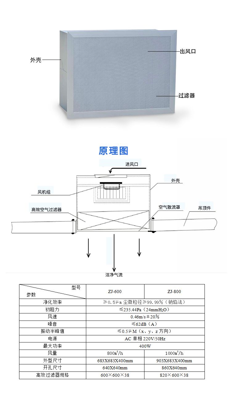 ZJ系列空气自净器是一种提供局部洁净工作环境的空气净化单元。由初效空气过滤器、风机、高效空气过滤器及静压箱组成。外壳采用钢板喷塑处理,箱体内覆盖海绵、整机噪音低、结构简单、使用方便,安装可进行室外空气自循环。空气自净器是一种简单的室内净化送风设备。