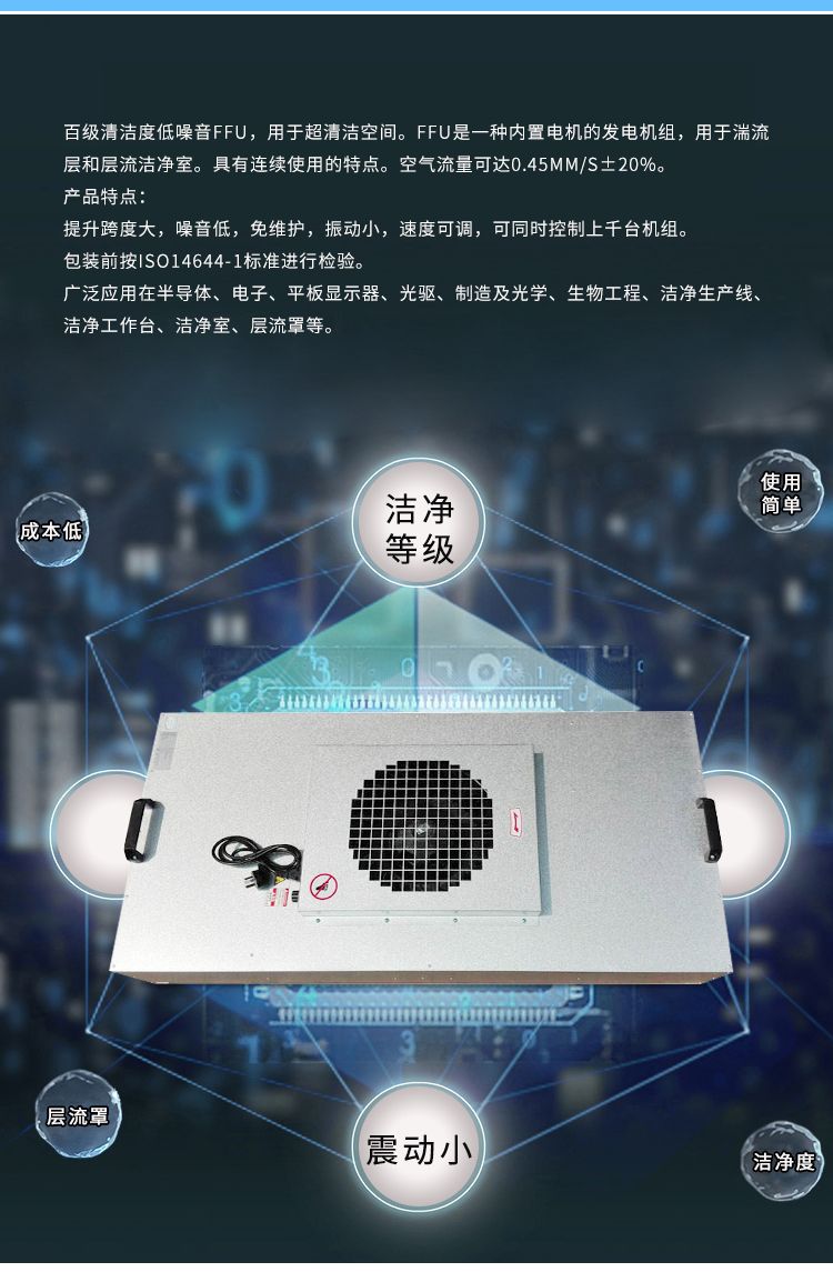 FFU层流送风单元由于其体积小,安装简便,可模块化连接使用,因而被广泛应用于洁净室、洁净层流带、洁净棚等场合。