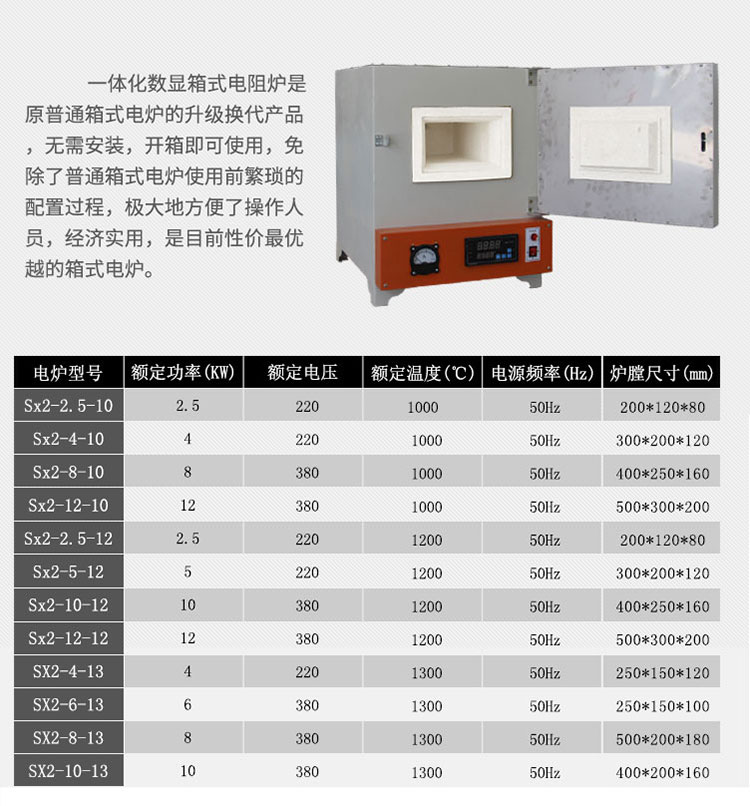 该产品是原普通箱式电阻炉的升级换代产品,无需安装,开箱即可使用,极大的方便了操作人员,经济实用,是目前性价比较高的箱式电炉,可供工矿企业、科研单位和院校实验室等机构作进一步元素分析和测定,还可以进行小型钢件淬火、退火、回火等热处理加工。高温炉还可加热用于金属、陶瓷的烧结、溶解和分析等。
