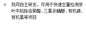 有机磷 | 剪碎,称取1.0g于烧杯; 加6mL提取液,拌匀; 超声提取10min; 加0.1-0.5g活性炭脱色; 双层滤纸过滤于试管中; 60℃~70℃水浴挥干,待测。 | 对照: 干净空试管加1mL水和1mLⅠ号,震荡1min; 加1mLⅡ号,震荡20下,60℃水浴10min; 取出冷却至室温(20-30℃),吸取液体到比色皿; 放入仪器,按键进行空白测试。 样品: 已挥干试管加1mL水和1mLⅠ号,震荡1min; 加1mLⅡ号,震荡20下,60℃水浴10min; 取出冷却至室温(20-30℃),吸取液体到比色皿; 放入仪器,按 |