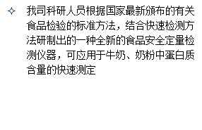 蛋白质 | 固体:1.0g/100g 液体:0.1g/100mL | 奶粉:1.0-40g/100g 牛奶:0.1-4g/100mL | 适用于牛奶、奶粉等 |