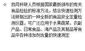 ² 多功能食品安全快速分析是依据物质分子对可见光产生的特征吸收光谱及光吸收定律(朗伯-比尔定律)的原理,用未知浓度样品与已知浓度标准物质比较的方法进行定量分析的仪器。