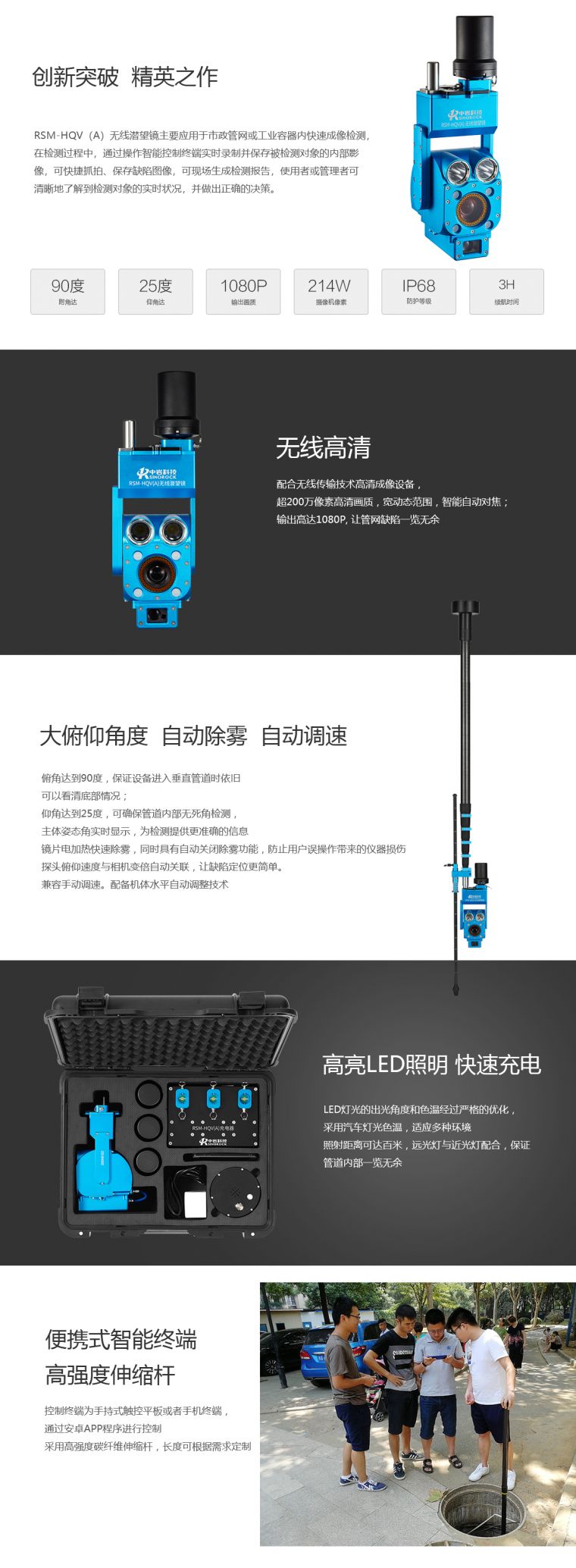 1、无线传输:配合无线传输技术,方便连接移动终端。2、高清画质:高清成像设备,画质高清,动态范围宽,智能自动对焦,可输出1080p高清画面, 让管网缺陷一览无余。