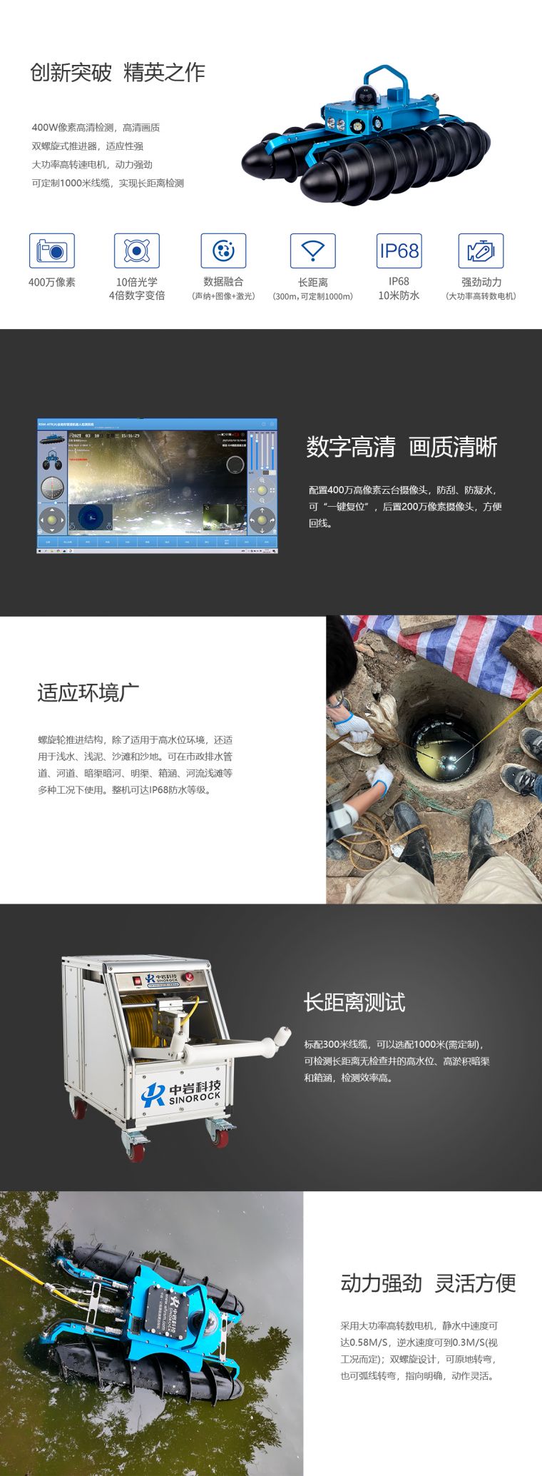 1、适应环境广:螺旋轮推进结构,除了适用于高水位环境,还适用于浅水、浅泥、沙滩和沙地。可在市政排水管道、河道、暗渠暗河、明渠、箱涵、河流浅滩等多种工况下使用。