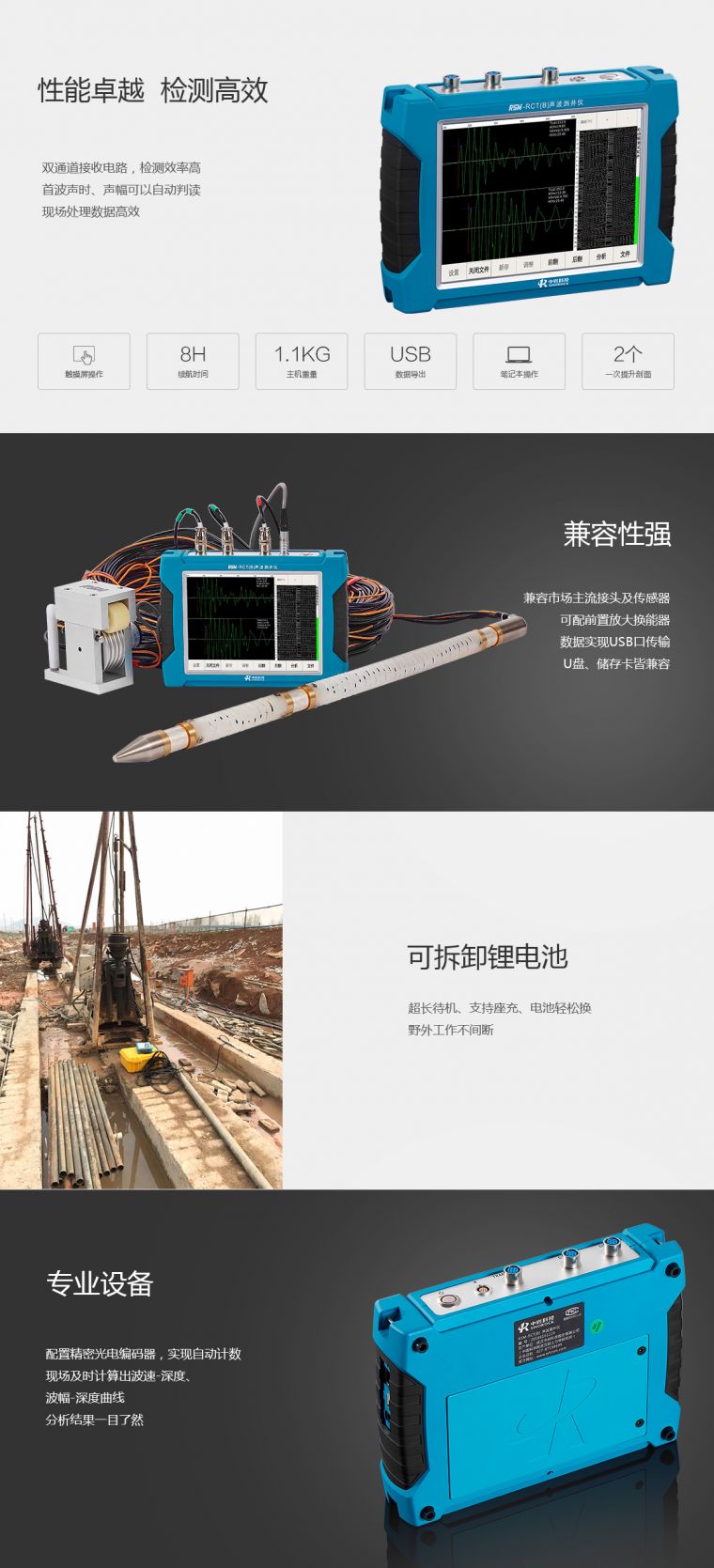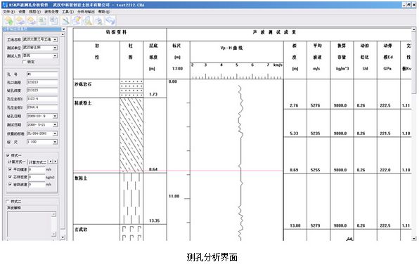 1、仪器做工精细、采用专业机箱; 2、界面直观、操作方便; 3、双通道接收电路,检测效率高; 4、首波声时、声幅可以自动判读、现场处理数据高效; 5、数据实现USB口传输、U盘、储存卡都适应; 6、地质(岩石)钻孔专业检测设备,配置精密光电编码器,实现自动计数; 7、现场及时计算出波速-深度、波幅-深度曲线,分析结果一目了然; 8、交直流两用,电池供电8小时以上; 9、可兼容市场主流接头及传感器(可配前置放大换能器)。