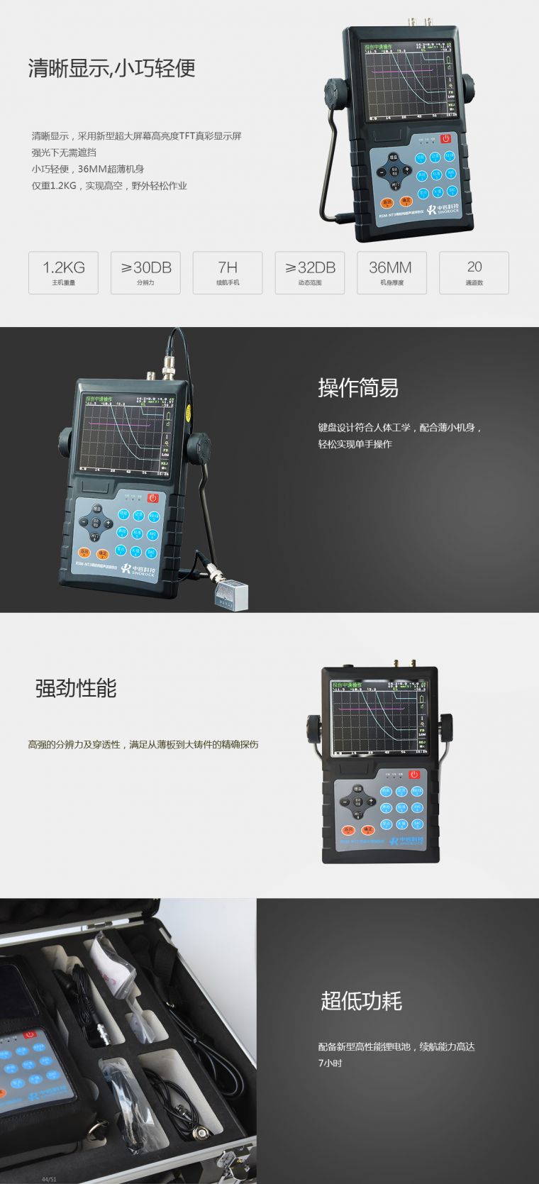 1.清晰显示:采用新型超大屏幕高亮度TFT真彩显示屏,强光下无需遮挡。 2.小巧轻便:36mm超薄机身,仅重1.2kg,实现高空,野外轻松作业。 3.操作简易:键盘设计符合人体工学,配合薄小机身,轻松实现单手操作。 4.超低功耗:配备新型高性能锂电池,续航能力高达7小时。 5.强劲性能:高强的分辨力及穿透性,满足从薄板到大铸件的精确探伤。