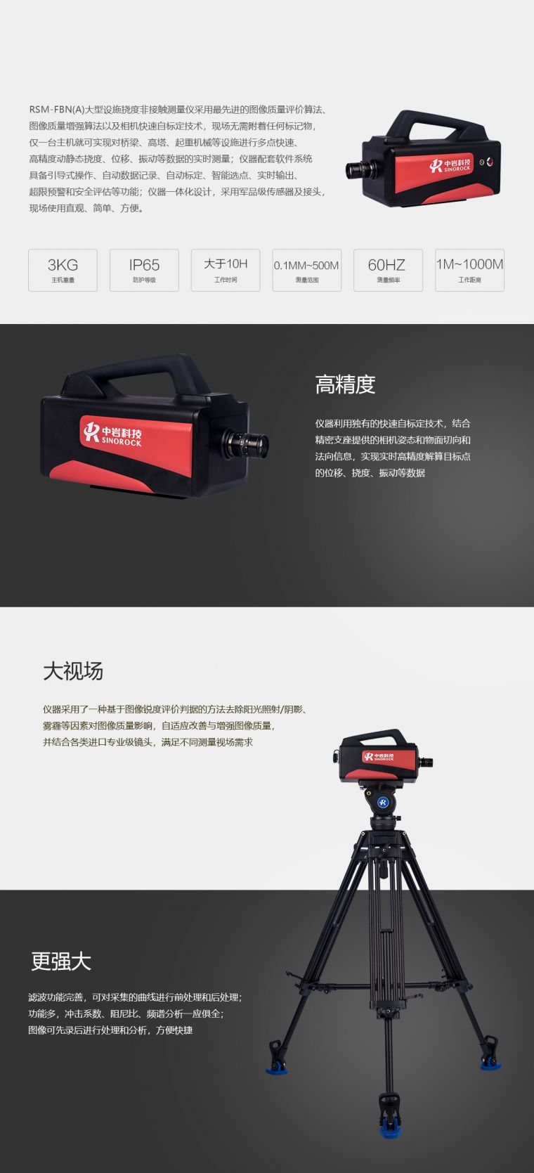 1、高精度 仪器利用独有的快速自标定技术,结合精密支座提供的相机姿态和物面切向和法向信息,实现实时高精度解算目标点的位移、挠度、振动等数据。 2、大视场 仪器采用了一种基于图像锐度评价判据的方法去除阳光照射/阴影、雾霾等因素对图像质量影响,自适应改善与增强图像质量,并结合各类进口专业级镜头,满足不同测量视场需求。 3、更便捷 仪器利用GPRS将测量数据上传到云端,对设施进行实时安全预警和实时在线安全评估。用户可24h接收手机预警信息,并通过手机或PC端随时查看相关信息。