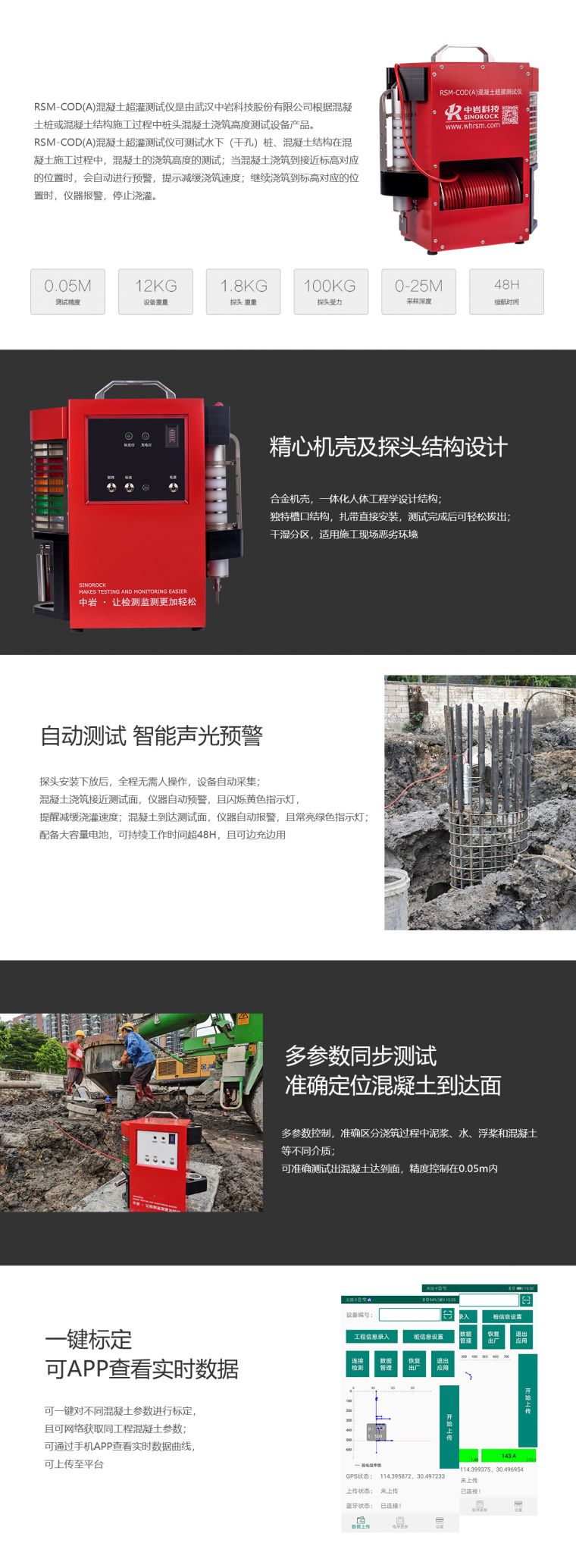 用于水下(干孔)混凝土桩混凝土浇筑过程中高度控制 RSM-COD(A)混凝土超灌测试仪可测试水下(干孔)桩、混凝土结构在混凝土施工过程中,实时检测混凝土浇筑高度;当混凝土浇筑到接近标高对应的位置时,仪器会自动进行预警,提示减缓浇筑速度;继续浇筑到标高对应的位置时,仪器报警,停止浇灌。