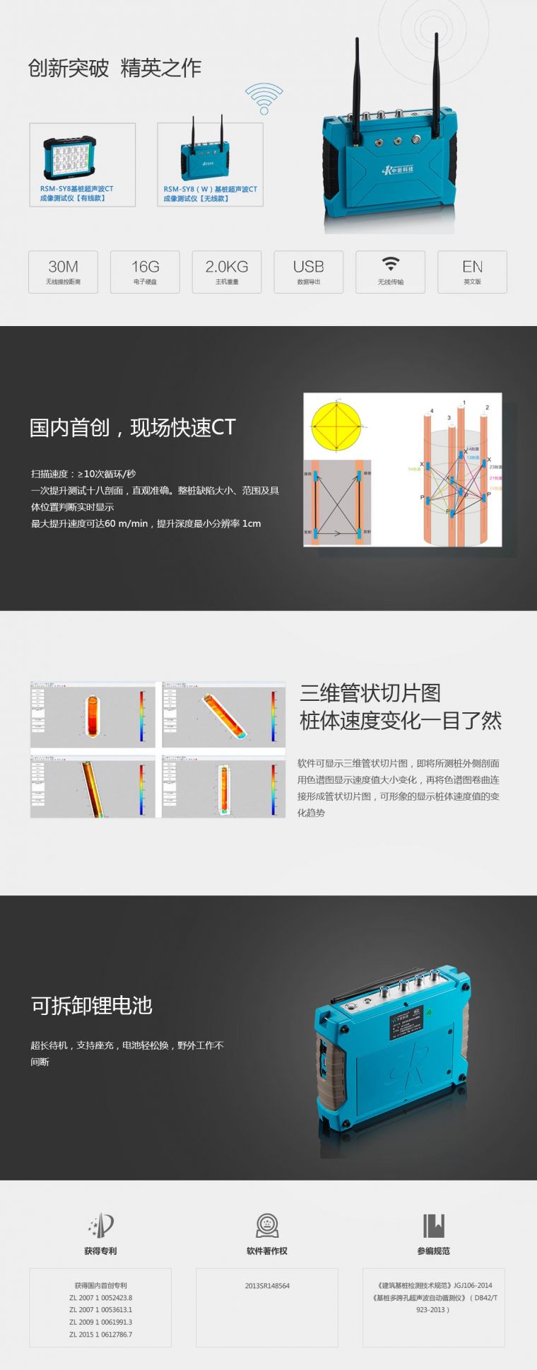 1、远程无线方式操控主机,无线操控距离可达30m; 2、体积小,重量轻,携带方便,便于操作; 3、最大一次提升采集4管18个剖面(6平测及12斜测),整桩缺陷大小、范围及具体位置判断实时显示; 4、配备专业桩基三维CT成像软件,可对测试结果生成各类三维动态图,缺陷定位准确,可对取芯等后续补充验证提供重要依据; 5、自动计数提升装置连接方便、快捷,最大提升速度可达60 m/min; 6、仪器采用工程塑料机壳,结构牢固,重量轻,耐用; 7、可拆卸锂电池,支持座充,可另配备用电池,保证野外工作不间断; 8、采用进口接插件,整机防水设计; 9、提升深度最小分辨率 1cm。