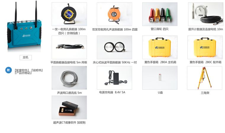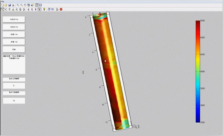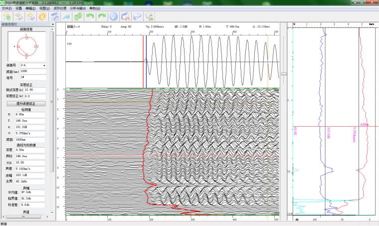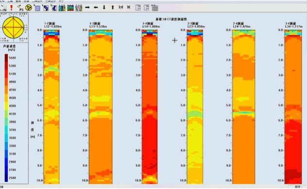 『CT层析成像软件界面』 1、软件可显示三维管状切片图,即将所测桩外侧剖面用色谱图显示速度值大小变化,再将色谱图卷曲连接形成管状切片图,可形象的显示桩体速度值的变化趋势。 2、软件可显示三维低速异常体图,直观拟物的显示出低速异常体的位置,大小范围。可以通过鼠标操控基桩绕任意方向旋转,也可以任意放大或放小桩体各个部位,更立体的显示异常体。 3、软件可显示速度等值线图,将各剖面所测速度以色谱图的形式显示再画出等值线构成速度等值线图,可具体的显示出桩体各个位置的速度值大小范围。 『超声波射透法分析软件』 1、主操作界面测点波形曲线、整桩波列图、剖面深度曲线联动显示 2、波列图、数据表、灰度图之间任意切换显示 3、剖面声速深度曲线、声幅深度曲线、PSD深度曲线显示比例可任意调节 4、可以单独观测每个测点的频谱图,便于主频分析 5、声速和声幅判读算法准确,也可对声速、声幅单独判读 6、支持斜测和扇测数据分析处理 7、具有自动管斜修正功能,修正前、后数据可同时显示打印 8、输出结果内容有多种样式选择并组合,兼容多地报告格式。 9、输出结果表头可自定义选择 ,并可保存自定义表头模板 10、可将波列图和深度曲线图同时输出到单页报告纸上 11、输出方式可以支持图片输出、打印输出、Word文件输出、Excel文件输出等多种模式 12、可批量生成完整报告