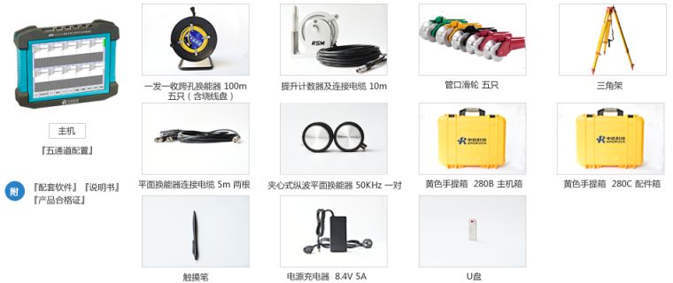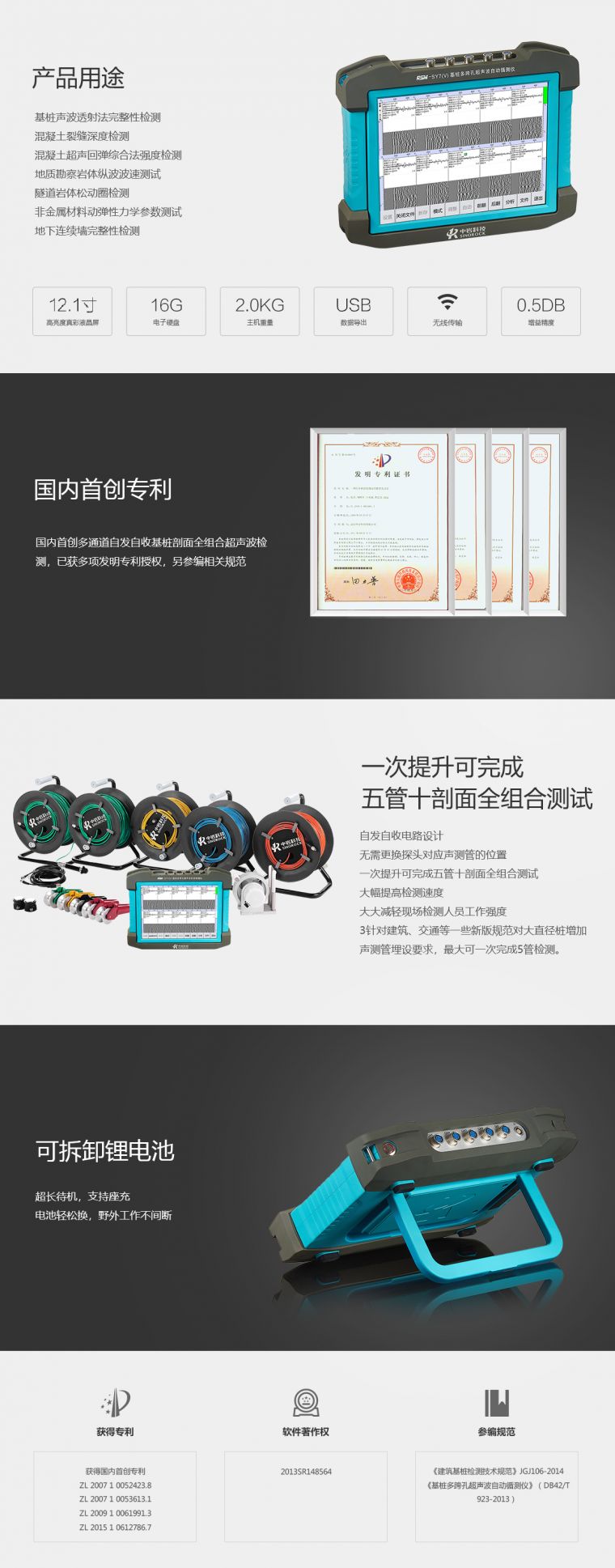 1.国内首创多通道自发自收基桩剖面全组合超声波检测,已获多项发明专利授权; 2.自发自收电路设计,无需更换探头对应声测管的位置,一次提升可完成五管十剖面全组合测试,大幅提高检测速度,大大减轻现场检测人员工作强度; 3.针对建筑、交通等一些新版规范对大直径桩增加声测管埋设要求,最大可一次完成5管检测。 4.配新型前置放大探头,空气中有效测距可达2米,混凝土中测距可达10米。 5.每个剖面测试波形各自可控调节增益延迟; 6.可自动搜索首波位置、自动调整放大倍数; 7.采用12.1寸超大真彩液晶显示屏,现场可同时清晰的观测10个剖面测试波形、波列、波速、波幅等信息,测试过程中整桩质量一目了然; 8.测点移距1~50cm可调,无漏点,无需重复测试; 9.自动计数提升装置连接方便、快捷,最大提升速度可达60m/min; 10.仪器采用高强度塑料机壳,结构牢固,美观耐用; 11.采用进口接插件,整机防水设计。