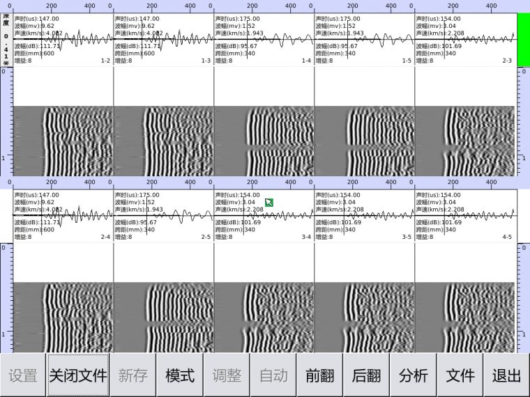 【超声波射透法分析软件】 1、主操作界面测点波形曲线、整桩波列图、剖面深度曲线联动显示 2、波列图、数据表、灰度图之间任意切换显示 3、剖面声速深度曲线、声幅深度曲线、PSD深度曲线显示比例可任意调节 4、可以单独观测每个测点的频谱图,便于主频分析 5、声速和声幅判读算法准确,也可对声速、声幅单独判读 6、支持斜测和扇测数据分析处理 7、具有自动管斜修正功能,修正前、后数据可同时显示打印 8、输出结果内容有多种样式选择并组合,兼容多地报告格式。 9、输出结果表头可自定义选择 ,并可保存自定义表头模板 10、可将波列图和深度曲线图同时输出到单页报告纸上 11、输出方式可以支持图片输出、打印输出、Word文件输出、Excel文件输出等多种模式 12、可批量生成完整报告