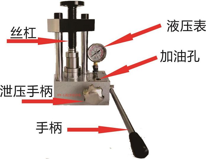 把待压的模具或其它附件放于压片机主油缸工作台上,手工拧紧大丝杠把模具拧紧。关闭放油阀(顺时针拧紧)摇动压油手柄直至所需压力值保持几分钟后打开放油阀,取出模具即可。
