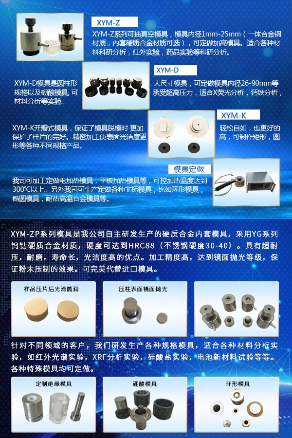 XYM系列精密模具是和YP系列台式粉末压片机配套使用的。主要用于各领域里新型材料的测试,分析和研究。该产品压出的压片达到国外进口同类模具压片的水平。