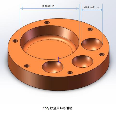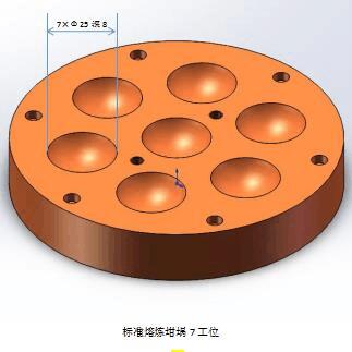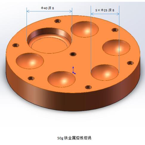 标配的7个坩埚 定制的非标尺寸坩埚 5、真空度:标配旋片泵可达10-3mbar,选配用本公司分子泵可达10-5mbar 6、非自耗式起弧电极:钨针(W) 7、适用范围:可用于熔炼熔点低于钨金属的金属材料 8、熔炼温度:最高可达3500℃,几乎可熔化所有金属