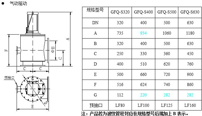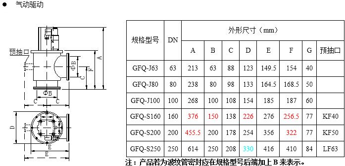 主要参数 | 适用范围:1×10-5Pa~1×105Pa;(氟橡胶) 1×10-6Pa~1.2×105Pa;(波纹管) 打开时阀针上的压差:≤3×104Pa任意方向(DN200气动), ≤1×105Pa任意方向(其它); 阀体和阀座漏率:<1.3×10-7Pa·L·s-1 **保养循环次数:200,000次; 阀体烘烤温度:≤150℃; 气动阀门开关:0.4~0.7MPa;(压缩空气); 安装位置: 气动驱动:任意(DN≤160);密封面朝向真空(DN>160); 电磁驱动:任意(波纹管密封);密封面朝向真空(氟胶圈密封); 电源: 气动驱动:交流220V 50Hz,6W或直流24V,3W; (除上述规格,特殊规格可定做); 阀门开启或关闭时间 -气动驱动: ≤1s; 阀门位置指示 -气动驱动:带有启闭位置指示开关(磁性开关) | ||||||||||||||||||||||||||||||||||||||||||||||||||||