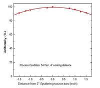 技术参数 | 1、阳极护罩直径:Ø3.5" 2、所用靶材:直径2"(50.8mm),非磁性靶最大厚度1/4",磁性靶最大厚度1/16" 3、磁铁:NdFeB稀土永磁体 4、靶材利用率:30% 5、所需功率:DC最大1000W,RF最大500W 6、溅射电流:最大3A 7、溅射电压:100V-1000V 8、溅射时腔体真空度:5mtorr-100mtorr 9、溅射均匀性曲线: