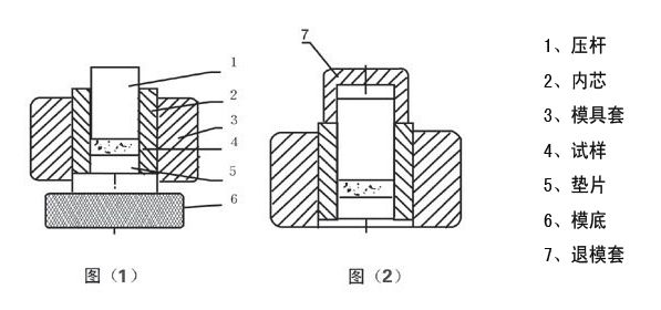 压样退模 | 按图(1)压片,将垫片放在模具中央,将内芯顺时针方向排列在模底上,将模具套套在内芯的表面,装填粉末,放上压杆加压即可 。按图(2)退模,取下模底,放上退模套加压即可退模。