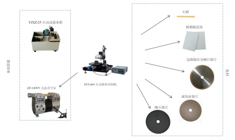 SYJ-400自动精密切割机及其所用的耗材、辅助设备和特殊工装。