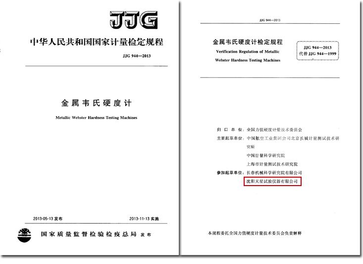 由天星公司参加起草的国家计量检定规程JJG944-2013《金属韦氏硬度计》