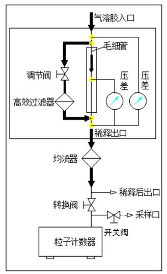 SX-L301N型高浓度粒子计数器中的稀释器是采用自身高浓度气流旁通式原理达到粒子稀释的目的(见面原理示意图)。