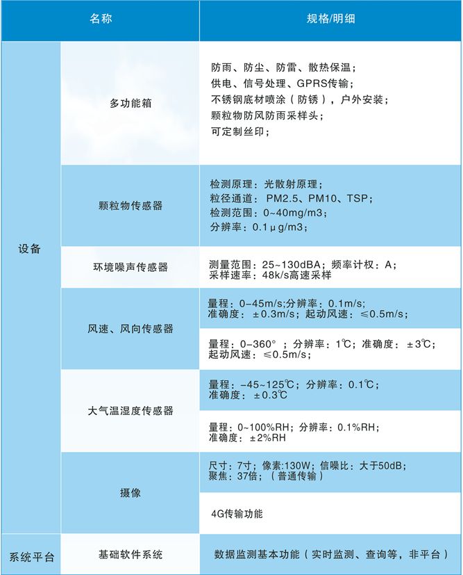 监测终端与数据平台可构成监测系统。终端集成了大气颗粒物浓度监测、温湿度及风速风向监测、噪声监测、污染物超标视频抓拍;数据平台是一个互联网架构的网络化平台,终端所得数据均能通过有线或无线网络及时传递到数据平台便于管控,平台还具有对数据的报警处理、记录、查询、统计、报表输出等多种功能。