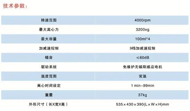 | 1 | 水平式 | 100ml*4 | 5000r/min | 4500xg |