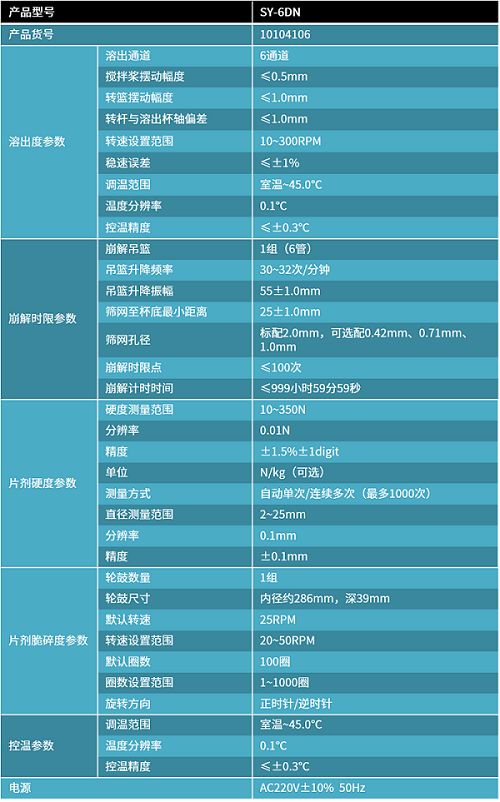 SY系列多功能片剂测定仪在药物分析领域已有超过40年的应用,严格遵循现行的《中国药典》规范及仿制药一致性评价标准 。SY-6DN智能片剂四用测定仪集溶出度、崩解时限、片剂硬度、片剂脆碎四项功能于一体,广泛应用于制药企业、医药科研、教研和药检部门等。