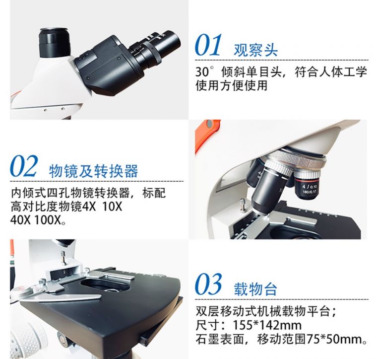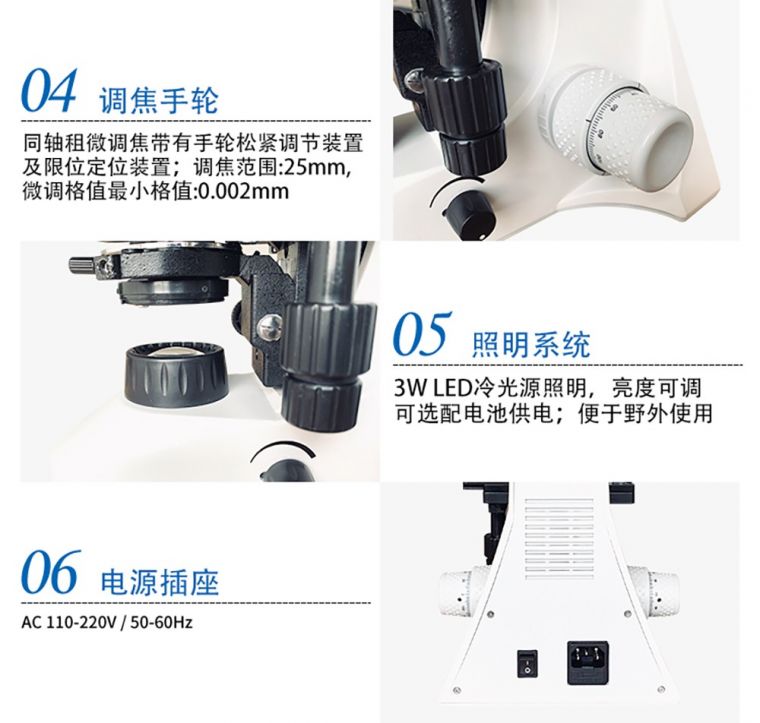 聚光镜:N.A.1.25阿贝聚光镜,精确限位设计齿轮齿条结构,确保更为准确的观察高度。高度可自行调节。