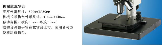 机械式载物台外形尺寸:185mmX140mm,移动范围:横向35mm,纵向:30mm | ||