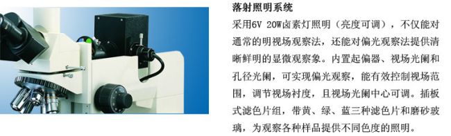 落射照明器带视场光栏、孔径光栏、起偏振片,(黄,蓝,绿)滤色片和磨砂玻璃 | |