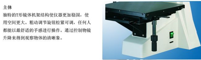 调焦机构 | 落射器升降,粗微动同轴调焦, 微动格值2μm,粗动松紧可调,带锁紧和限位装置 |