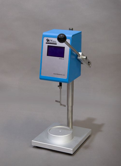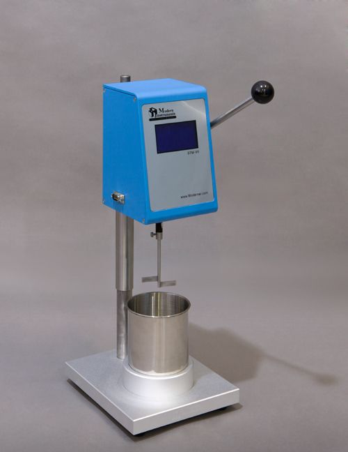 其原理是将偏置型桨叶浸入测试样中,用使其产生200rpm转速时的负荷值(对应为机械型斯托默粘度计的砝码质量)来表示该样的粘度,即gm粘度。通常将gm值对应转换成KU值(Krebs Unit)来表示该样的粘度。