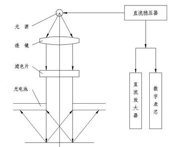 本仪器由探头、主机、标准板(黑白各块)、工作陶瓷板(黑白各二块)等组成。探头采用0°照射,45°接收的原理。当试样的反射光作用于光电池表面时产生电讯号输入到直流放大器进行放大,并予以读数显示(详见光路原理图)。