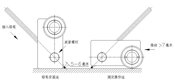 4、按附图装好铅笔,以0.5~1毫米/秒的速度推动至少7毫米,以没有使漆膜出现3毫米及以上划痕的硬铅笔的标示硬度表示漆膜的铅笔硬度。