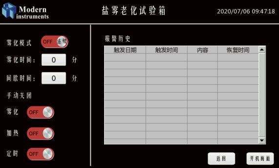 设定好温度后,加热系统开始工作,当实验舱和饱和桶的实际温度接近设定温度时(般在5℃内)这时喷雾系统开始工作,即试验开始;
