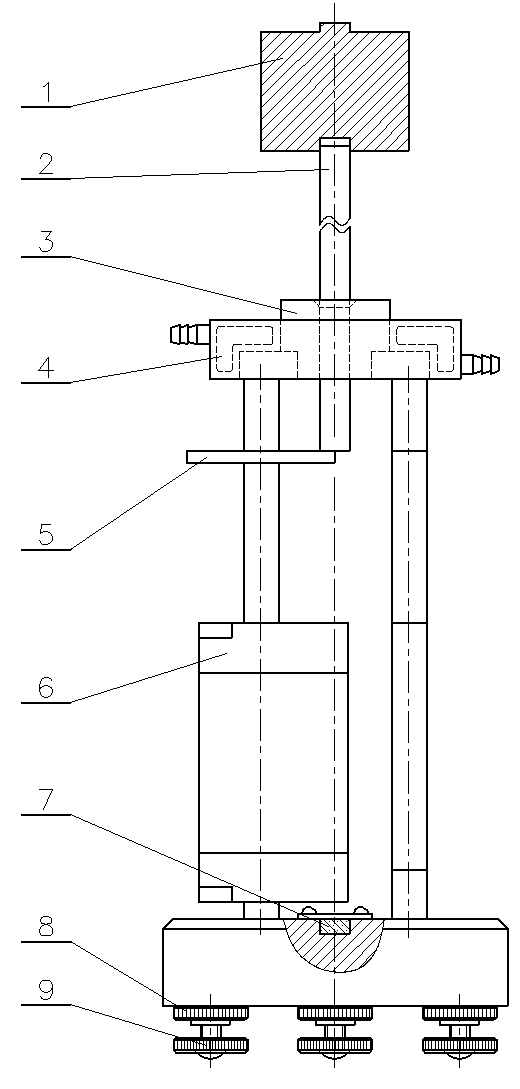 1、荷重砝码 2、落 棒 3、导 套 4、恒温水套 5、旋转挡板 6、光电开关 7、水 平 仪 8、固定螺母 9、调节螺钉