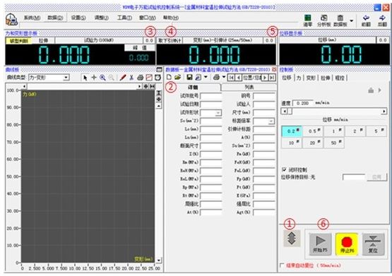 按照相关行业的试验要求设定加载速率,点击MaxTest试验开始按钮(如图标记⑥),当过屈服后,立即取下引伸计试验结束,取下试件,清洁试件的残渣继续试验重复以上试验过程即可