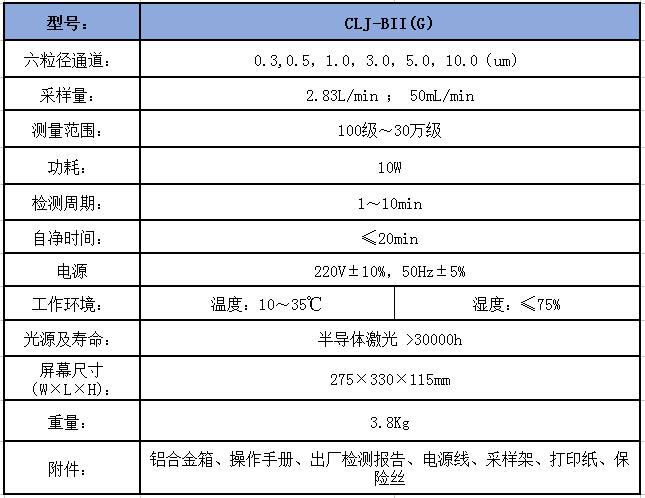 CLJ-BII(G)双流量激光尘埃粒子计数器集尘埃粒子计数器和空气过滤器滤出率测试仪的功能于一体,既可以检测环境的无菌净化效果,计量净化级别,又可以方便地测试空气过滤器的滤出率,达到一机两用的目的,是过滤器生产厂家和一次性使用输血输液器生产厂家及检测部门一机两用的理想仪器。