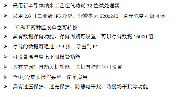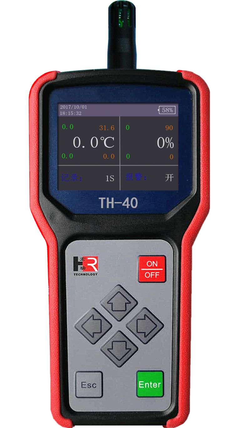 手持温湿度检测仪TH-40是一款可充电锂电池供电的智能化手持测量温湿度的仪表,具有体积小、响应速度快、测量精度高、稳定性和重复性好等特点,各项参数用户可自定义设置,操作简单。内置2400mA大容量聚合物可充电电池,超长待机;采用2.6寸工业级IPS彩屏,大屏显示各项技术指标和实时温湿度值,可在屏幕上查看历史数据,具有存储数据、数据导出、至大值和至小值显示、上下限报警等功能。本仪器广泛用于电子、制药、生物技术、航空航天等生产、科研部门,是制药企业和质量监督部门贯彻GMP规范加强生产环境管理的理想仪器。