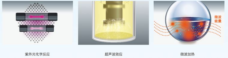 1.微波·超声波·紫外辐照三种能量源自由组合、搭配,程序设定开关时间。