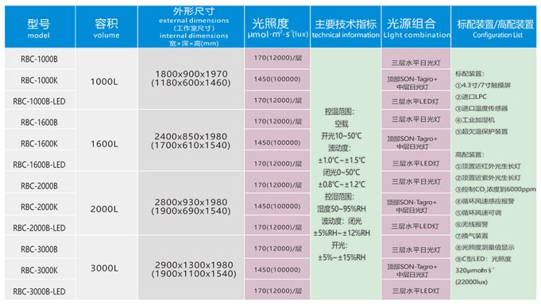 步入式植物生长箱适用于植物的生长和组织培养,种子发芽、育苗、微生物的培养试验;昆虫小动物的饲养;水质监测的BOD测定;药材、木材、建材的老化及使用寿命测试等,以及其他用途的光照,恒温、恒湿的专用试验设备。结构特色:具有光照、控温,控湿功能的高精度冷热恒温设备(高配控制CO2浓度)。采用先进的微电脑可编程技术控温,可设置多种参数(包括温度、湿度、光照度,CO2)模拟自然气候。多种模式控制可调,操作简便。 产品参数: