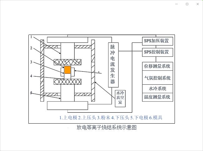 目前一般认为,SPS与热压(HP)有相似之处,但加热方式完全不同,它是一种利用通-断直流脉冲电流直接通电烧结的加压烧结法。通-断式直流脉冲电流的主要作用是产生放电等离子体、放电冲击压力、焦耳热和电场扩散作用。在SPS烧结过程中,电极通入直流脉冲电流时瞬间产生的放电等离子体,使烧结体内部各个颗粒均匀的自身产生焦耳热并使颗粒表面活化。与自身加热反应合成法(SHS)和微波烧结法类似,SPS是有效利用粉末内部的自身发热作用而进行烧结的。SPS烧结过程可以看作是颗粒放电、导电加热和加压综合作用的结果。除加热和加压这两个促进烧结的因素外,在SPS技术中,颗粒间的有效放电可产生局部高温,可以使表面局部熔化、表面物质剥落;高温等离子的溅射和放电冲击清除了粉末颗粒表面杂质(如去处表面氧化物等)和吸附的气体。