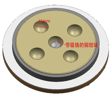 | 铜坩埚 | 水冷铜坩埚有5个工位(也可定制其它数量的工位) 每个工位均为半径是21mm的半球锅(也可定制其它尺寸),最大熔炼量10g(按铁液计算) 其中一个工位底部安装有吸铸装置