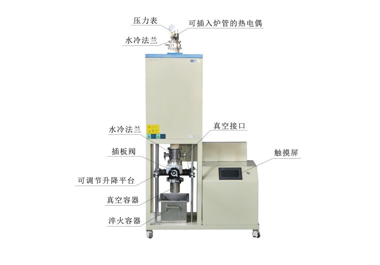 | 1.炉管底部固定有一个用于盛放淬火液体的不锈钢盒 2.炉管底部和液体盒之间安装有一个大型手动插板阀 | ||