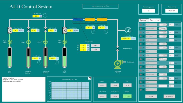 ALD 控制面板 | 1 、5路控制温控系统,可以加热ALD里管路和ALD容器内液体 2、2路气体脉冲交替控制系统(交替时间、交替次数等、用单片机或PLC 控制能够达到ms) | |||||
